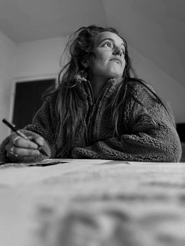 Amoureuse du dessin, je créer des paysages et des portraits à travers l’exploration de formes, de lignes, de volumes et de motifs. Je puise majoritairement mon inspiration dans la culture du tatouage et de la gravure. De ce fait, le travail du noir et du blanc résulte de ces inspirations : jouer avec la technique du clair-obscur, la simplicité d’un contraste monochrome qui cohabite avec la complexité de la multiplication des détails. L’utilisation d’une seule couleur en tant que fond me permet de mettre encore plus en valeur le travail de ce contraste.